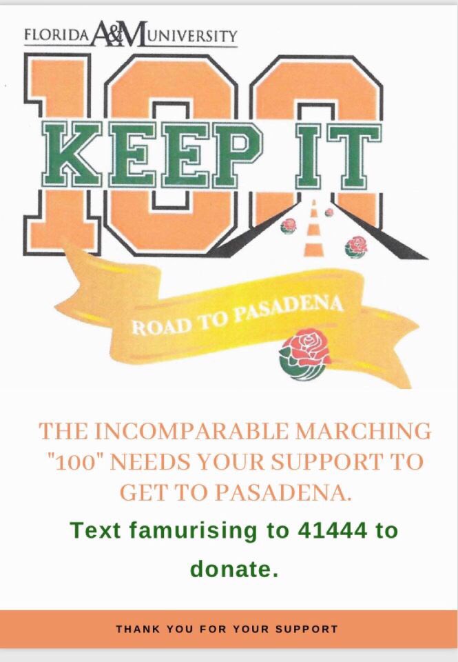 The Road Starts NOW! Please donate to the “Road to Pasadena” Campaign by texting famurising to 41444! Please support the Marching “100” as it embarks on fundraising for the Tournament of Roses Parade! We appreciate your support!