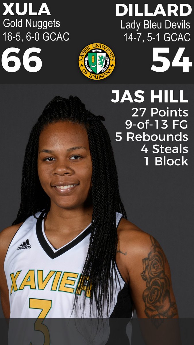 XULA trailed 17-12 after one quarter but outscored the Lady Bleu Devils in each of the last three quarters. XULA led 30-28 at halftime and took the lead for good, 43-40, on a Jalyn Hodge 3-pointer at 2:08 of the third period.